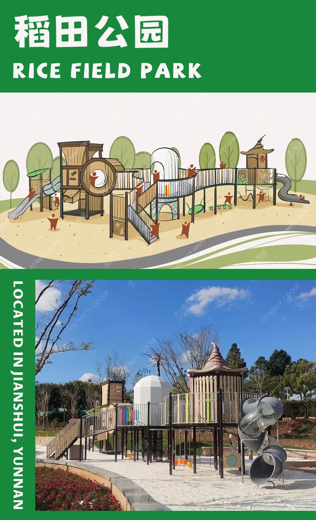 將稻谷收割機、谷粒、糧倉造型融入大型滑梯組合的設(shè)計,展示了稻谷收割后的晾曬、脫粒、篩選、儲藏等流程,更生動地進行研學(xué)科普與自然教育