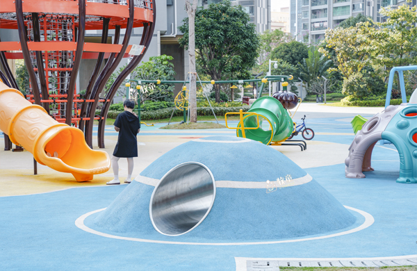 項目概況:樂園以科技主題打造,分為戶外樂園和架空層樂園兩大部分,游樂空間給出了適合各個年齡段的建議,以高塔基地為中心,周圍設置了云盤爬網、攀爬艙、毛毛蟲鉆洞、投籃架等多個游樂設施,架空層樂園設置了兵乓球桌以及適合幼兒的冒險屋樂園。所有游樂設施由一個探險游戲串聯,邀請兒童在空間中尋找線索;互動性十足的游樂空間讓兒童主導參觀體驗,并從多個層面吸引兒童互動,開啟一場奇妙大陸探險之旅。
